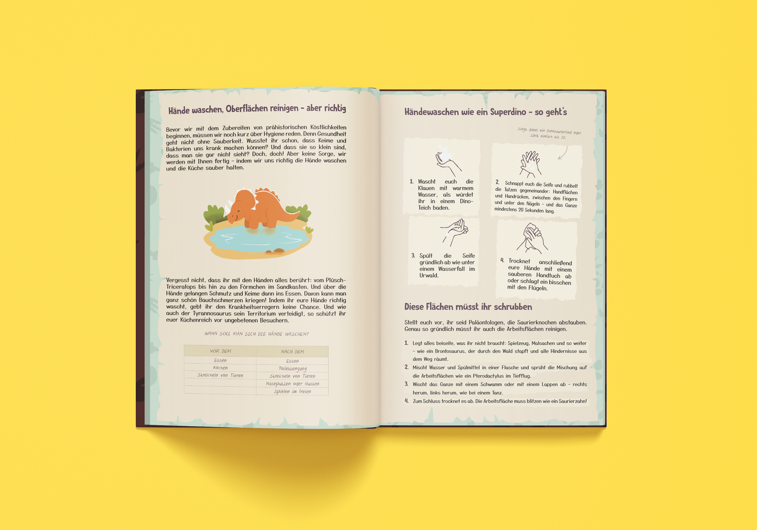 Das Buch enthält zudem kindgerechte Anleitungen zu Hygiene und Sicherheit in der Küche, damit die jungen Köche sicher und professionell wie echte Dino-Experten ans Werk gehen können.